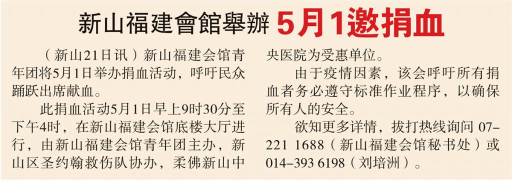 会馆动态 会馆活动 剪报室 青年团 April 22, 2022February 19, 2024 新山福建会馆举办-5月1邀捐血 Posted By: AdminTeam 471 Views 星洲日报剪报