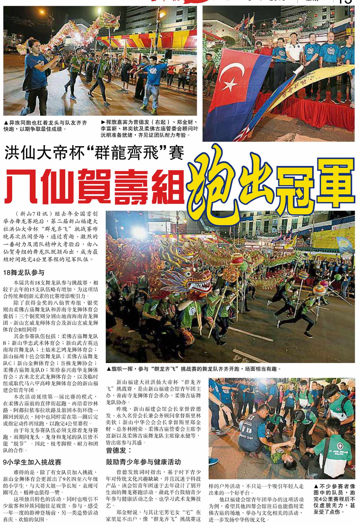 剪报室 青年团 January 8, 2018February 19, 2024 洪仙大帝杯“群龙齐飞”赛-八仙贺寿组跑出冠军 Posted By: AdminTeam 3126 Views 星洲日报剪报