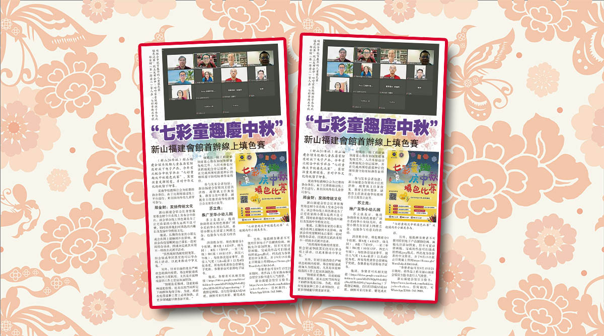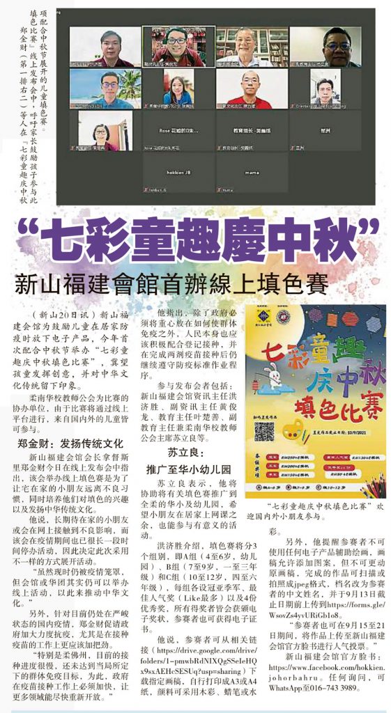 会馆动态 会馆活动 剪报室 August 21, 2021February 19, 2024 七彩童趣庆中秋-新山福建会馆首办线上填色赛 Posted By: AdminTeam 980 Views 星洲日报剪报