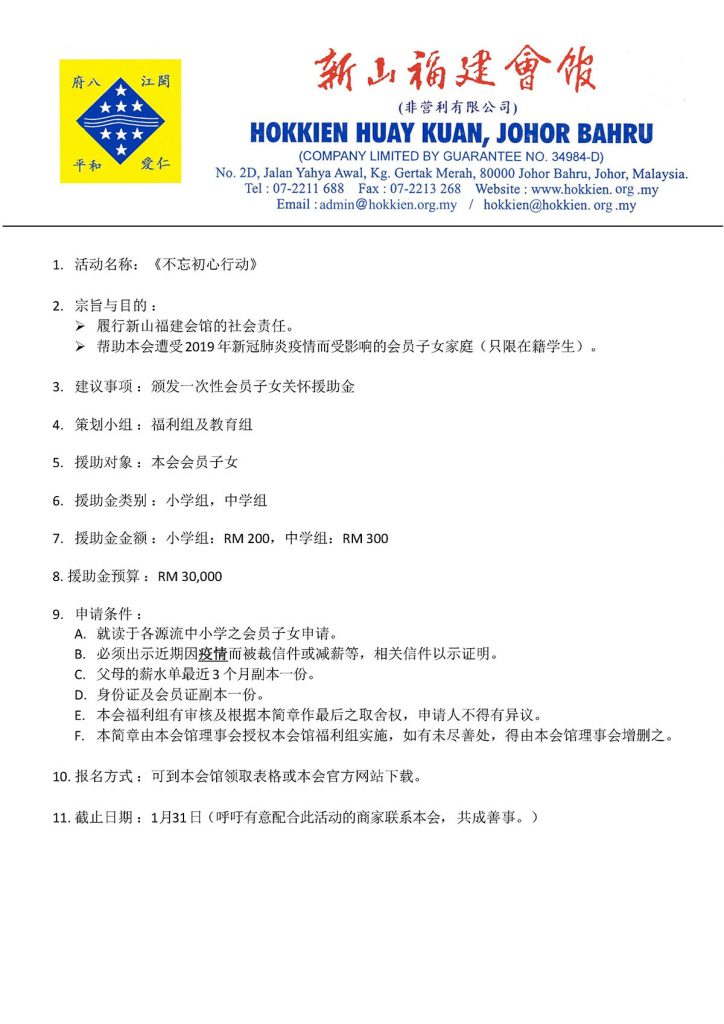 - 帮助本会遭受2019 年新冠肺炎疫情而受影响的会员子女家庭(只限在籍学生)。