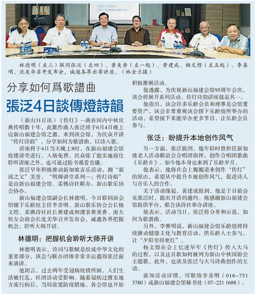 乐龄组 会馆动态 会馆活动 剪报室 June 1, 2022February 19, 2024 分享如何为歌谱曲-张泛4日谈传灯诗韵 Posted By: AdminTeam 650 Views 星洲日报剪报
