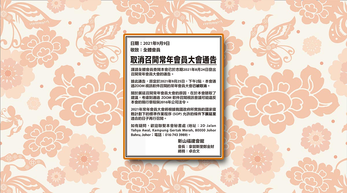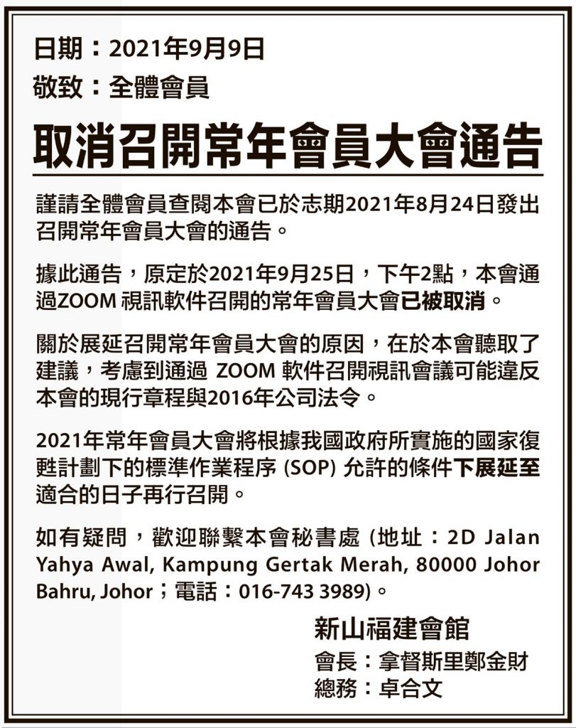会馆动态 会馆活动 剪报室 September 11, 2021February 19, 2024 取消召开常年会员大会通告 Posted By: AdminTeam 1006 Views 星洲日报剪报