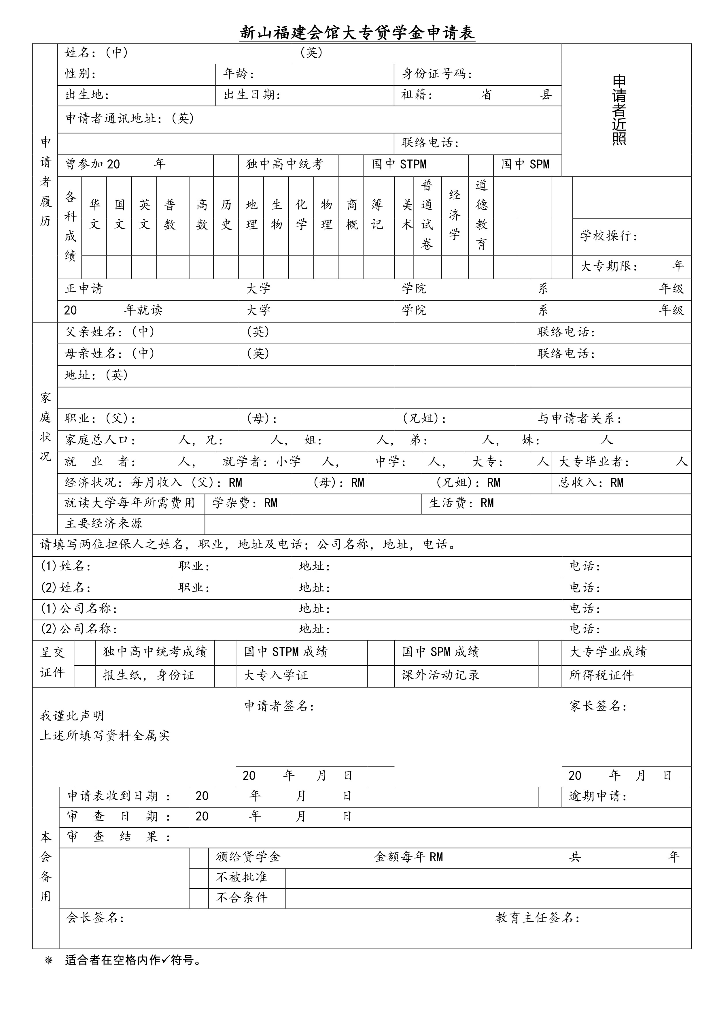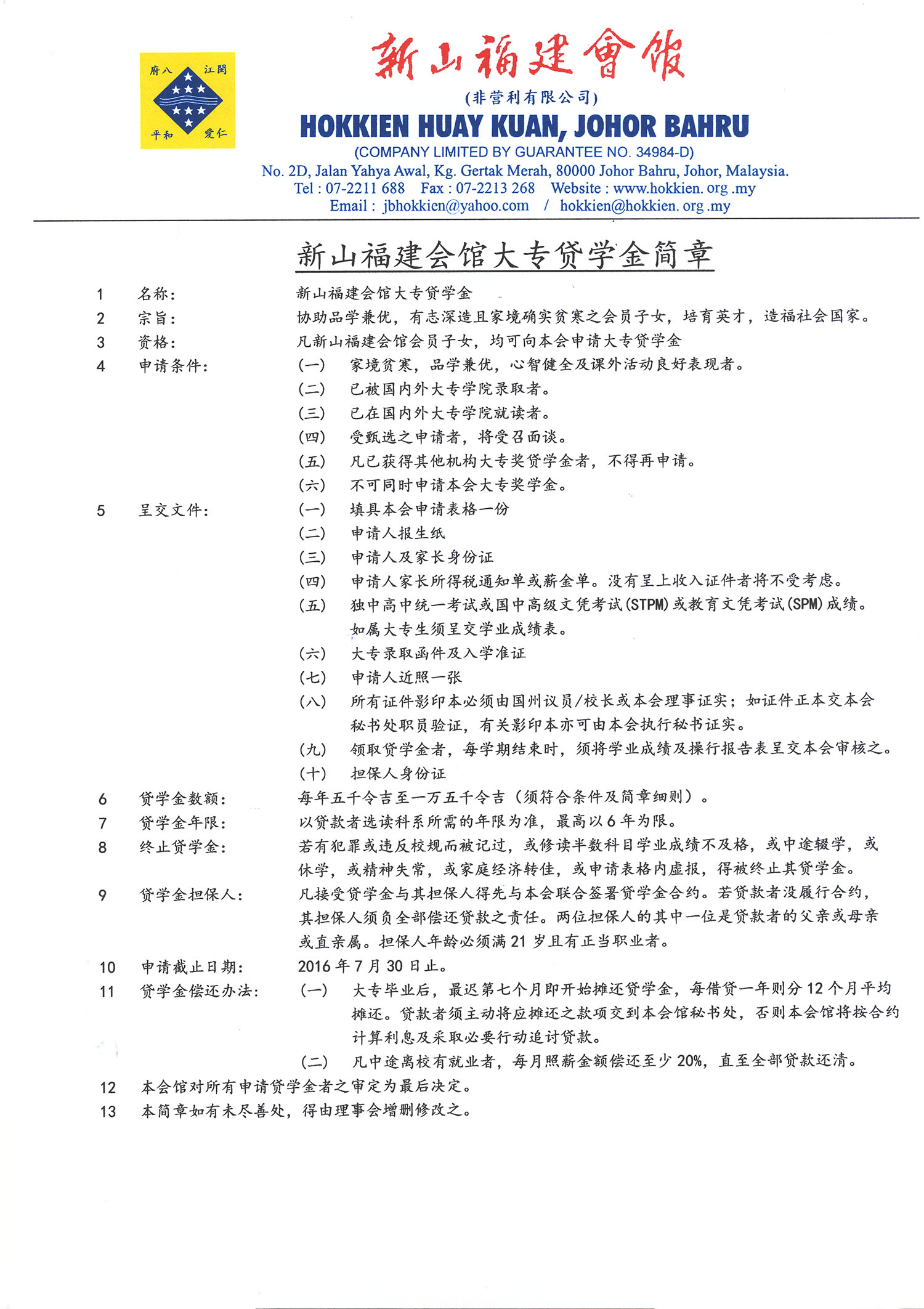 新山福建会馆2016年度会员子女大专院校贷学金即日起接受申请。