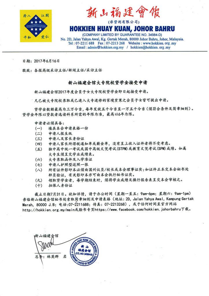 新山福建会馆2017年度会员子女大专院校贷学金即日起接受申请。