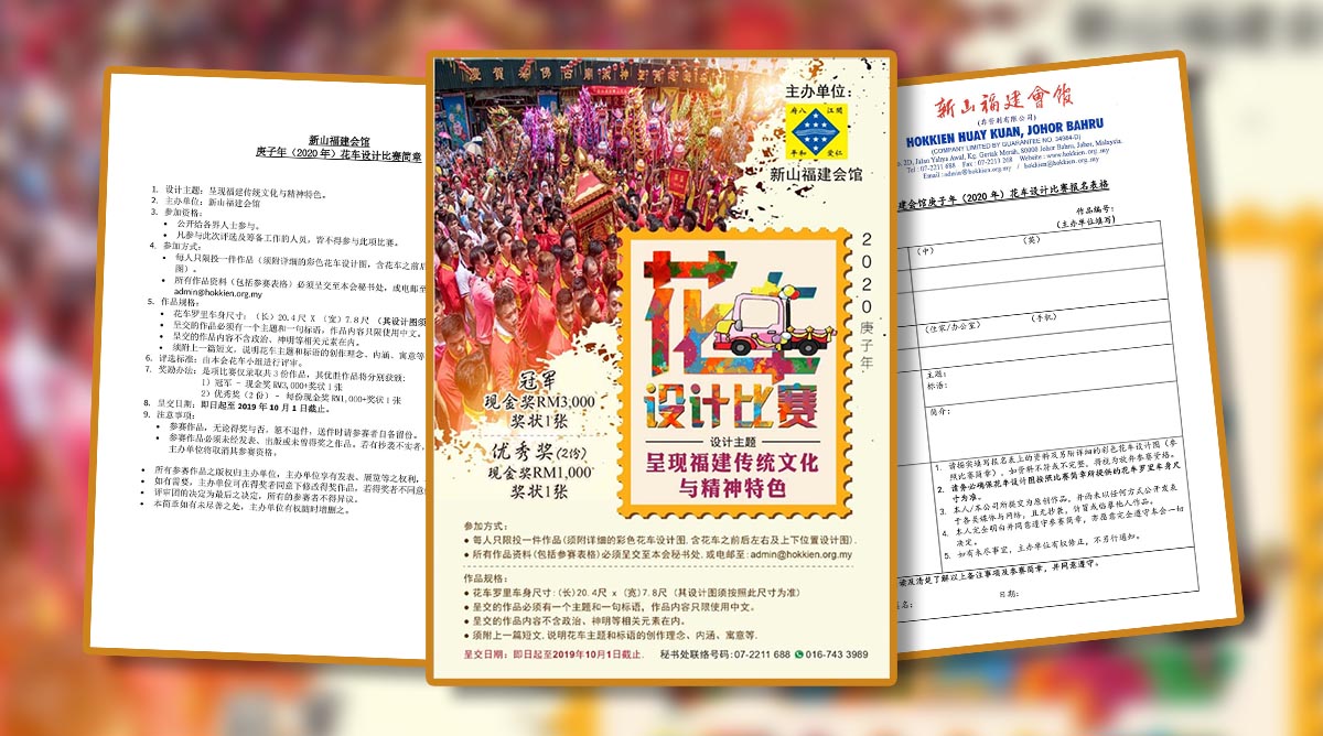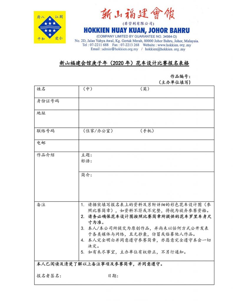 会馆动态 会馆活动 表格下载 August 14, 2019February 19, 2024 庚子年(2020年)花车设计比赛 Posted By: AdminTeam 3120 Views 下载比赛简章 下载比赛表格