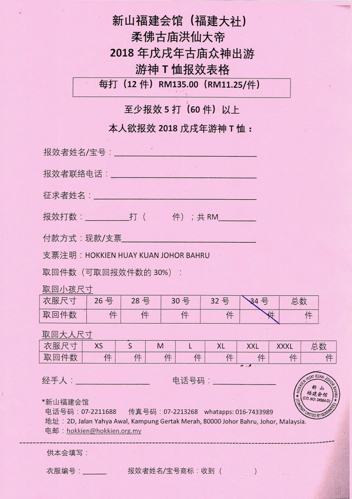 为了配合2018年3月7日至9日(农历戊戌年正月二十日至二十二日)恭随柔佛古庙洪仙大帝圣驾出游盛会,新山福建会馆即日起接受公众人士或商家报效印制游神衣服,每打(12件)为RM 135.00(RM11.25/件)。报效者必须报效印制至少5打(60件)以上的游神衣服,并获允在其所报效印制的游神衣服背面印上个人姓名或商标。凡报效游神衣者,可要求取回报效件数的30%自用。所有的游神衣服一律由新山福建会馆所指定的服装厂商印制。