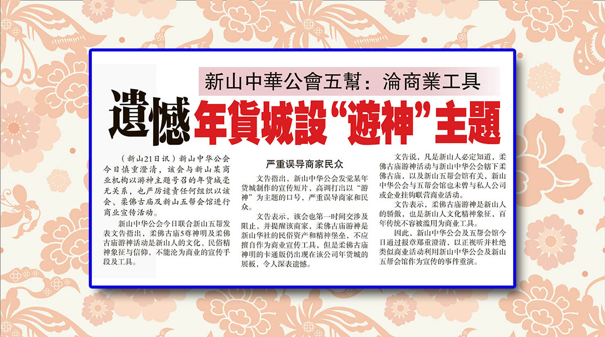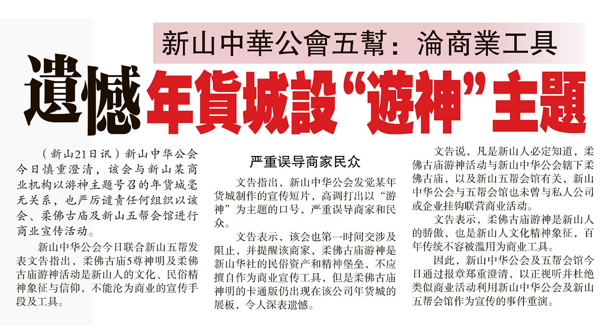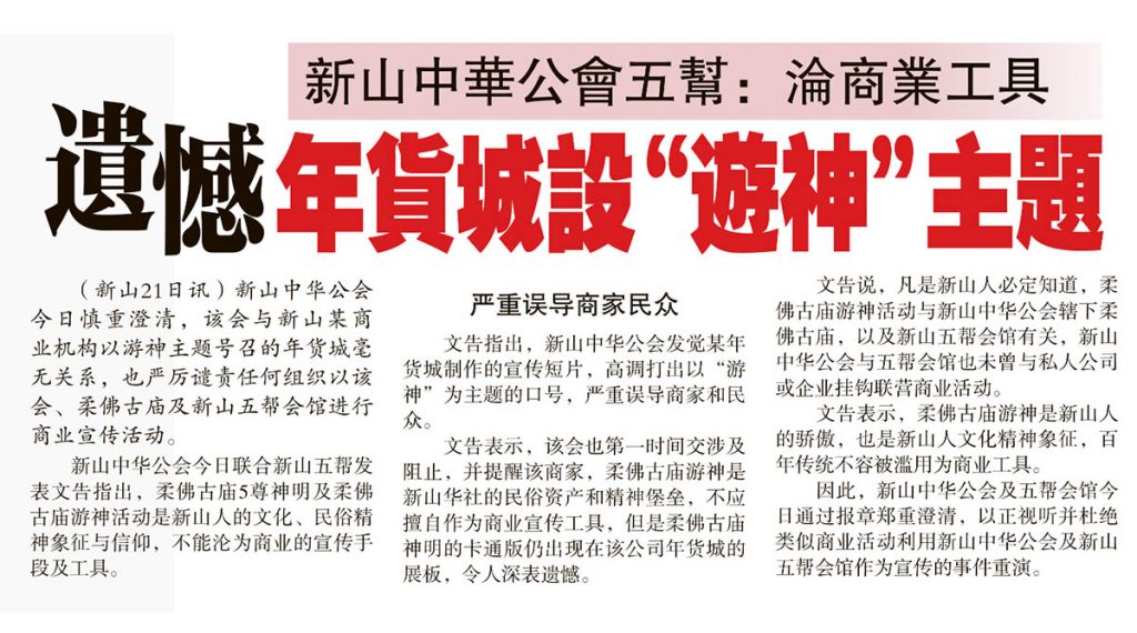 剪报室 January 22, 2022February 19, 2024 新山中华公会五帮-沦商业工具-遗憾年货城设“游神”主题 Posted By: AdminTeam 584 Views 星洲日报剪报