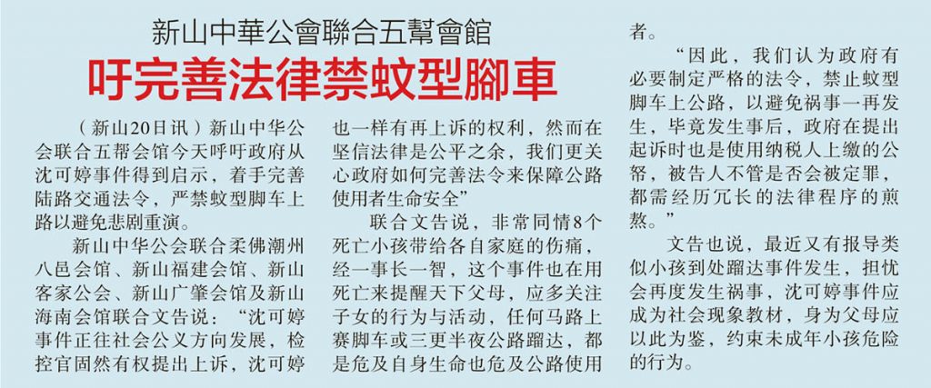 新山中华公会联合五帮会馆-吁完善法律禁蚊型脚车
