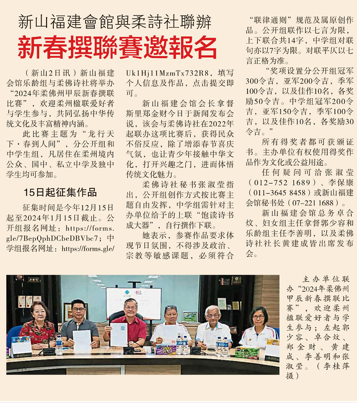 新山福建会馆与柔诗社联办-新春撰联赛邀报名