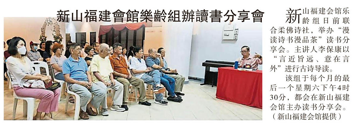 乐龄组 会馆动态 会馆活动 剪报室 最新消息 May 30, 2024June 4, 2024 新山福建会馆乐龄组办读书分享会 Posted By: AdminTeam 279 Views 星洲日报剪报