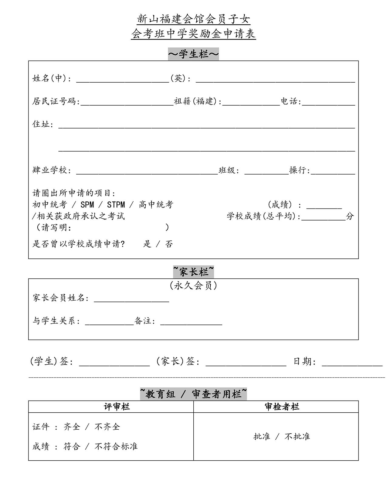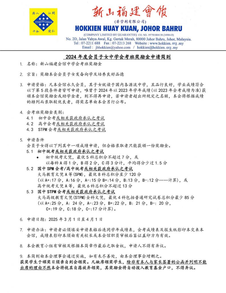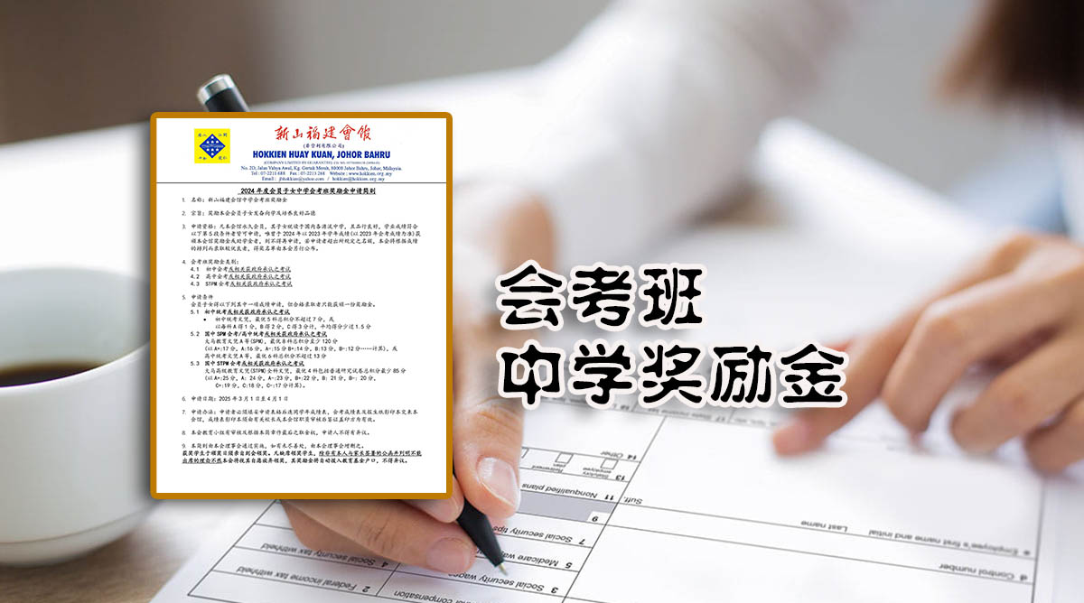 会馆动态 会馆活动 教育组 最新消息 表格下载 February 28, 2025February 28, 2025 新山福建会馆会员子女会考班中学奖励金 Posted By: AdminTeam 1122 Views 会考班中学奖励金申请细则下载 会考班中学奖励金申请表格下载