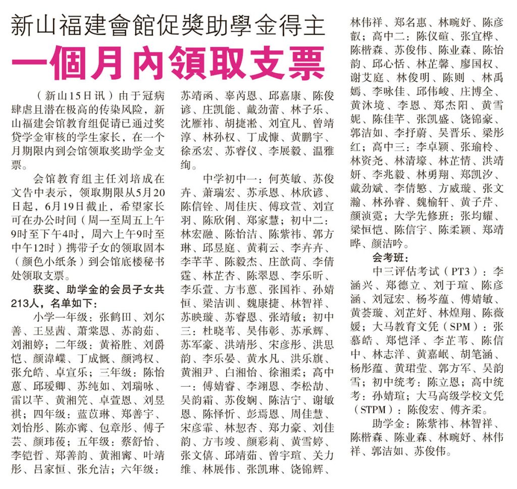 会馆动态 会馆活动 剪报室 教育组 May 16, 2020February 19, 2024 新山福建会馆促奖助学金得主-一个月内领取支票 Posted By: AdminTeam 996 Views 星洲日报剪报