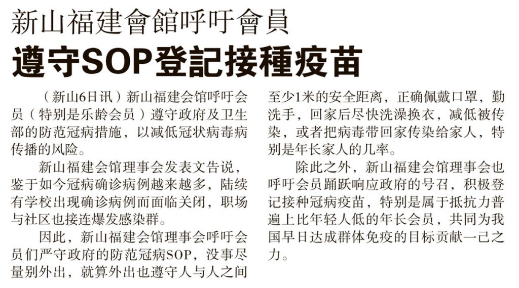 会馆动态 会馆活动 剪报室 May 7, 2021February 19, 2024 新山福建会馆呼吁会员-遵守SOP登记接种疫苗 Posted By: AdminTeam 864 Views 星洲日报剪报