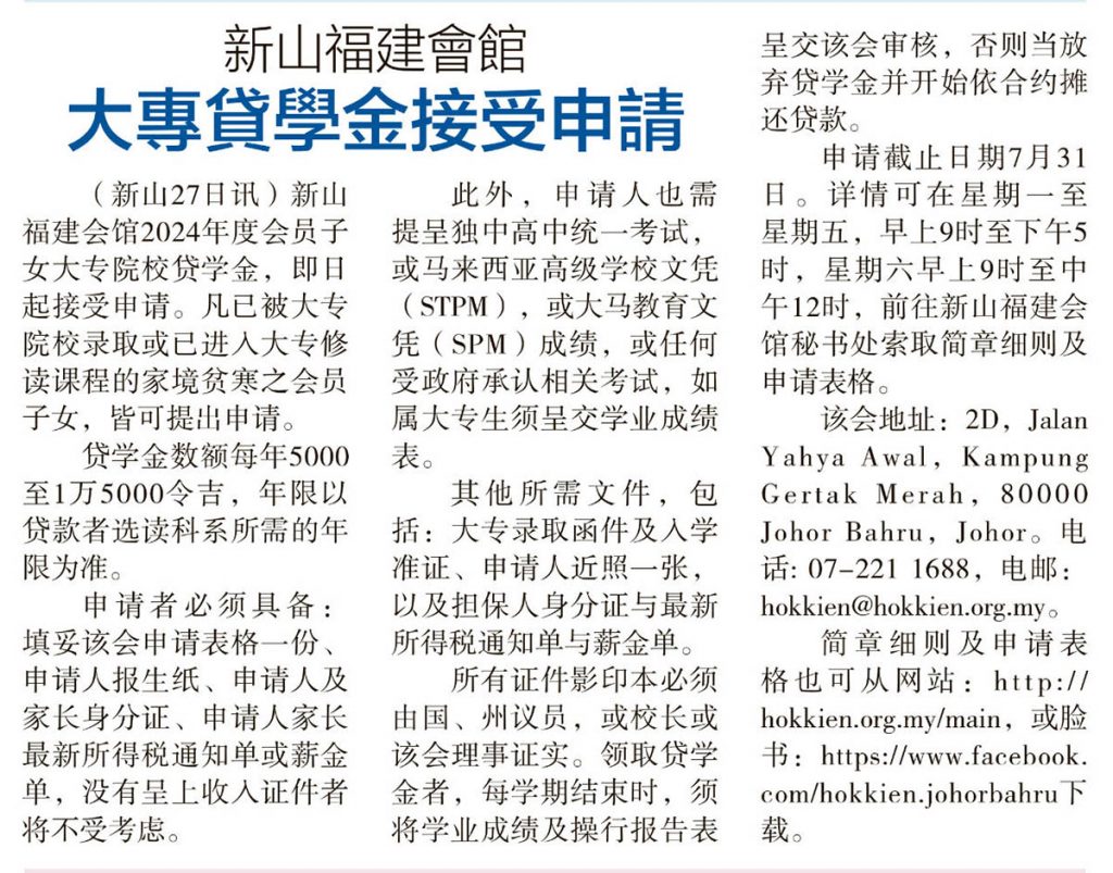 新山福建会馆大专贷学金接受申请