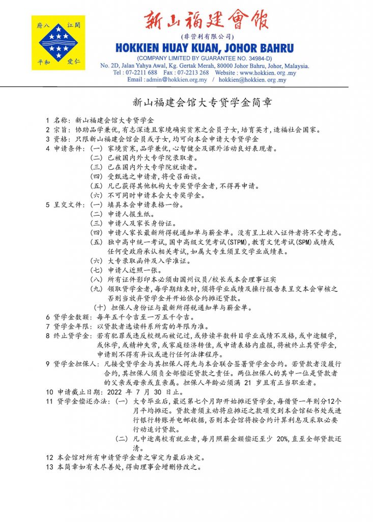 会馆动态 会馆活动 教育组 June 10, 2022February 19, 2024 新山福建会馆大专院校贷学金接受申请 Posted By: AdminTeam 477 Views 下载贷学金简章 下载贷学金表格
