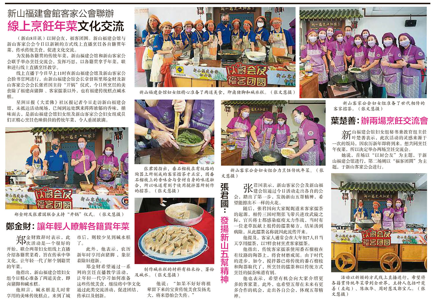 会馆动态 会馆活动 剪报室 妇女组 January 9, 2022February 19, 2024 新山福建会馆客家公会联办-线上烹饪年菜文化交流 Posted By: AdminTeam 854 Views 星洲日报剪报