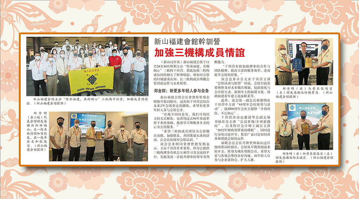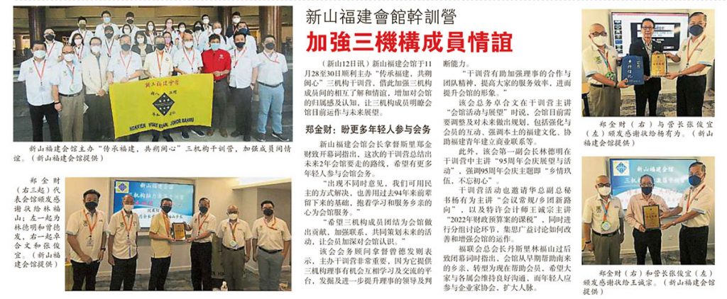会馆活动 剪报室 December 13, 2021February 19, 2024 新山福建会馆干训营-加强三机构成员情谊 Posted By: AdminTeam 502 Views 星洲日报剪报