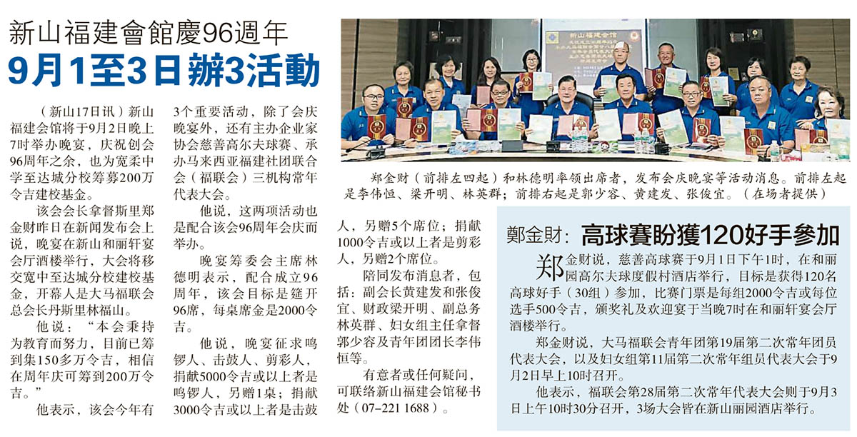 新山福建会馆庆96周年-9月1至3日办3活动