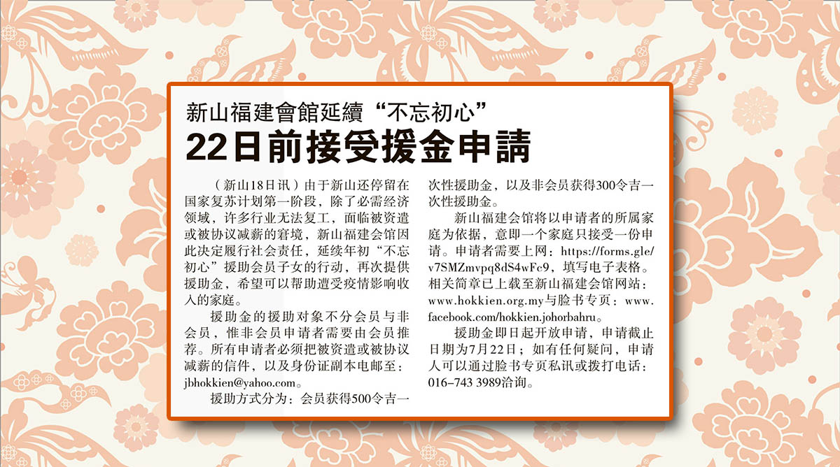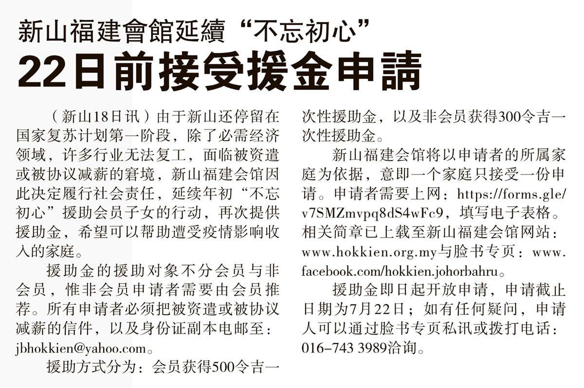 会馆动态 会馆活动 剪报室 July 19, 2021February 19, 2024 新山福建会馆延续“不忘初心”-22日前接受援金申请 Posted By: AdminTeam 392 Views 星洲日报剪报