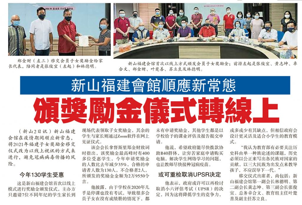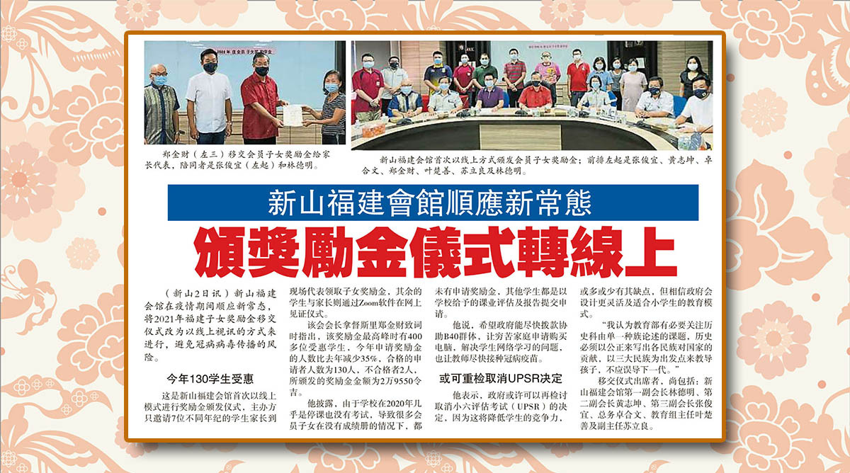 会馆动态 会馆活动 剪报室 教育组 May 3, 2021February 19, 2024 新山福建会馆顺应新常态-颁奖励金仪式转线上 Posted By: AdminTeam 684 Views 星洲日报剪报