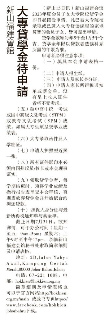 剪报室 June 16, 2023February 19, 2024 新山福建会馆-大专贷学金待申请 Posted By: AdminTeam 256 Views 星洲日报剪报 下载大专院校贷学金细则及表格