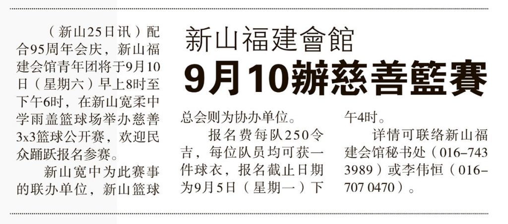 新山福建会馆-9月10办慈善篮赛