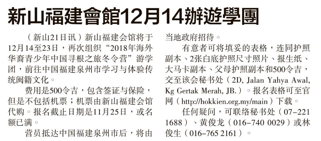 新山福建会馆12月14办游学团