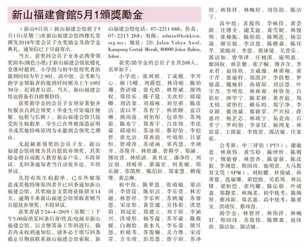 会馆动态 会馆活动 剪报室 教育组 April 10, 2019February 19, 2024 新山福建会馆5月1颁奖励金 Posted By: AdminTeam 1566 Views 星洲日报剪报