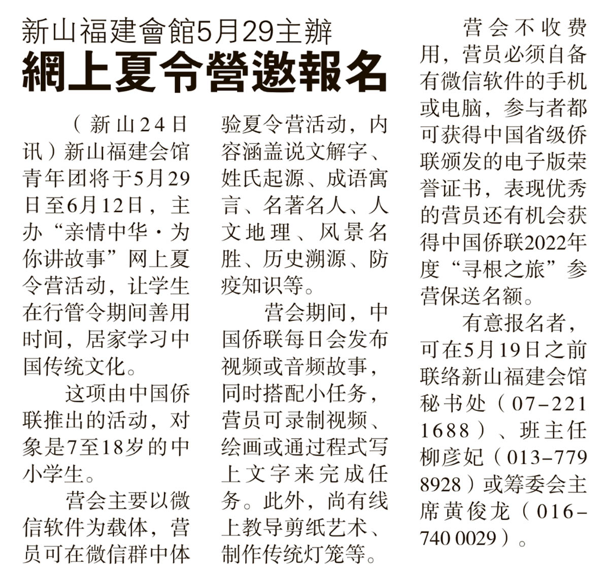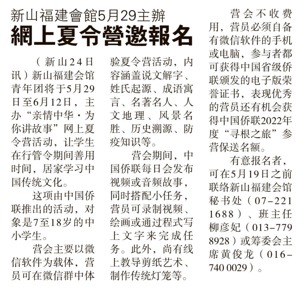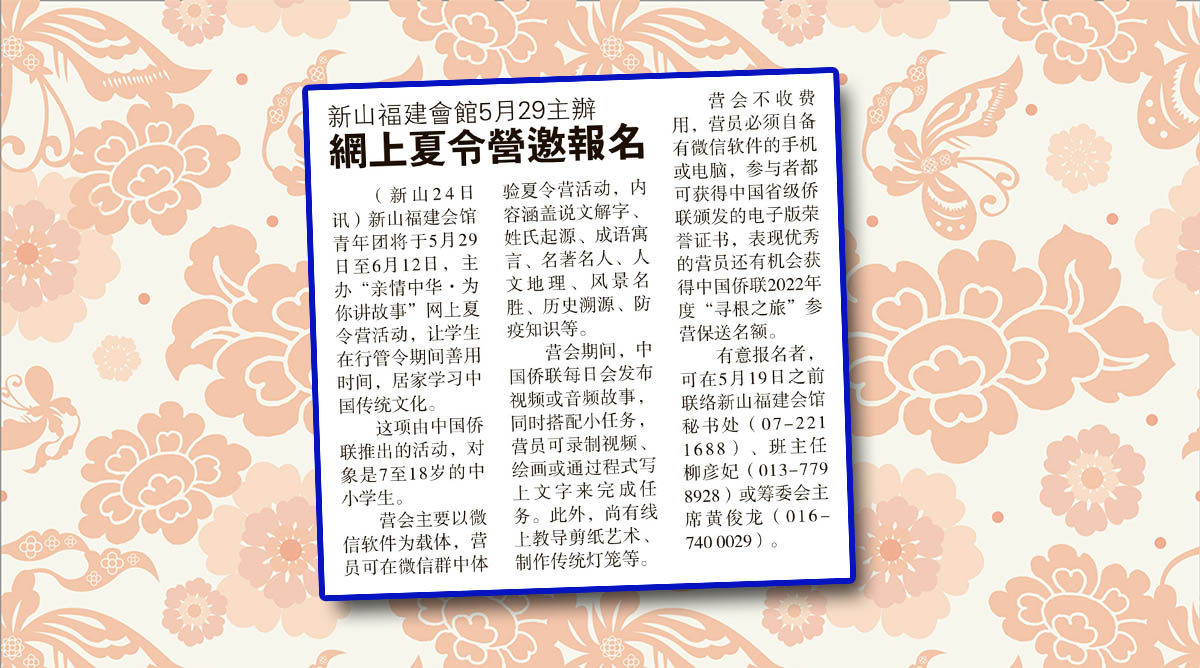 新山福建会馆5月29主办-网上夏令营邀报名