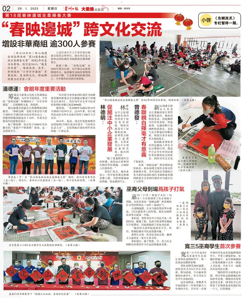 品牌活动 挥春比赛 January 29, 2023February 19, 2024 “春映边城”跨文化交流-增设非华裔组逾300人参赛 Posted By: AdminTeam 526 Views 星洲日报剪报