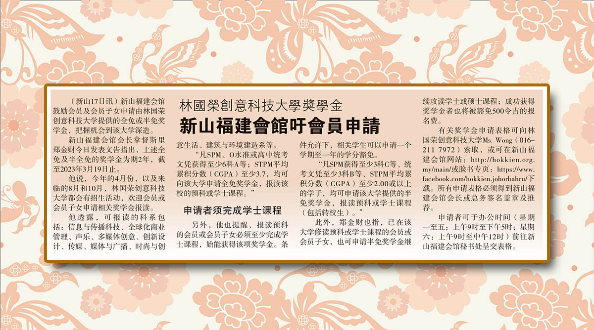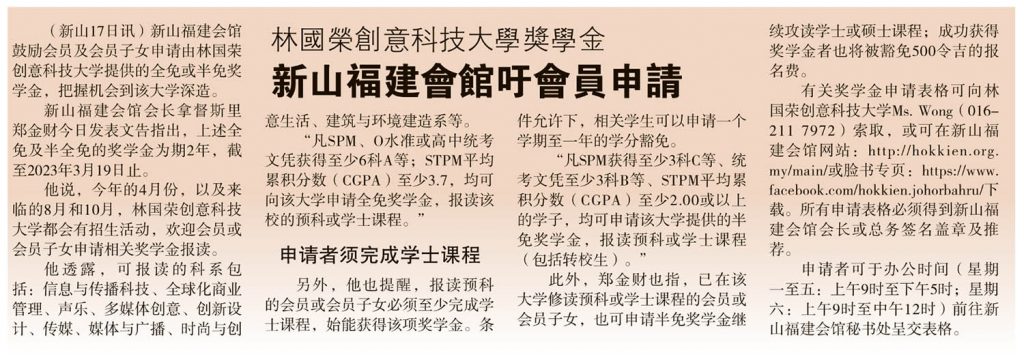 林国荣创意科技大学奖学金-新山福建会馆吁会员申请