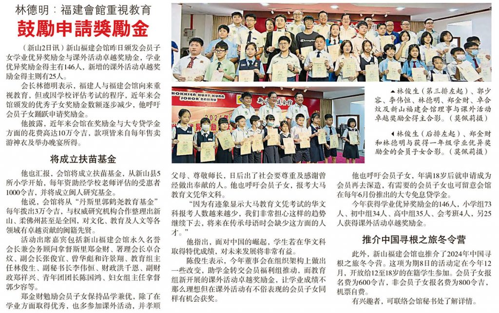 新山福建会馆5月1颁奖励金
