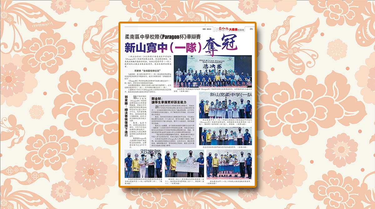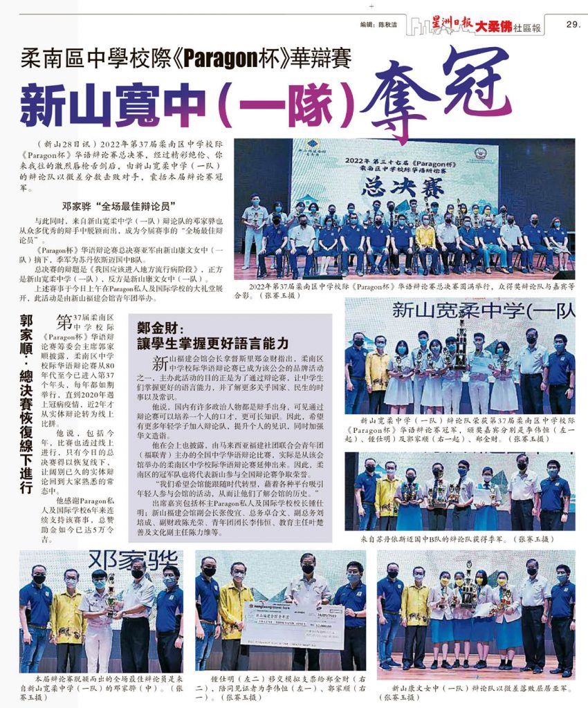 会馆动态 会馆活动 剪报室 青年团 May 29, 2022February 19, 2024 柔南区中学校际Paragon杯华辩赛-新山宽中一队夺冠 Posted By: AdminTeam 537 Views 星洲日报剪报