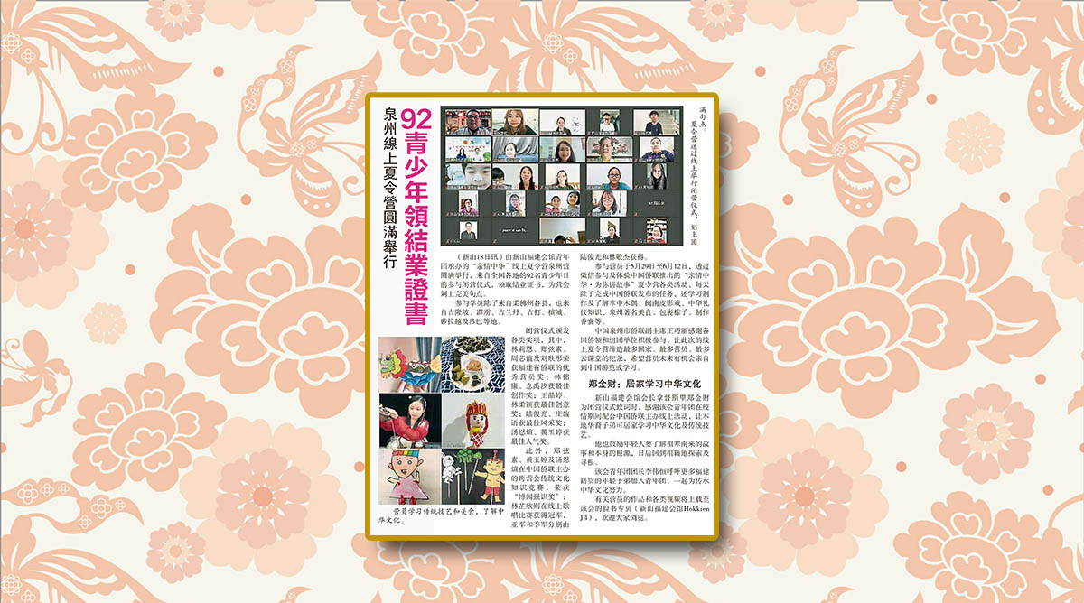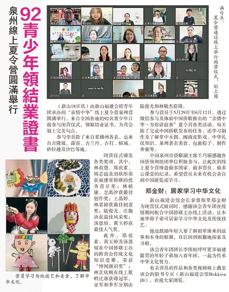 会馆动态 会馆活动 剪报室 青年团 June 19, 2021February 19, 2024 泉州线上夏令营圆满举行-92青少年领结业证书 Posted By: AdminTeam 500 Views 星洲日报剪报