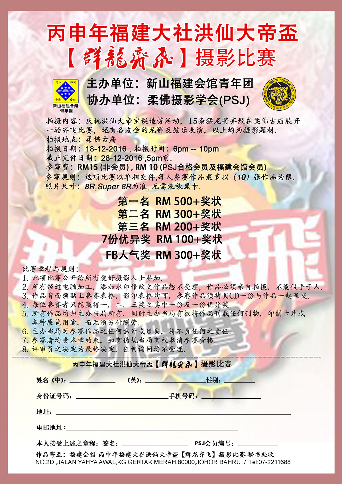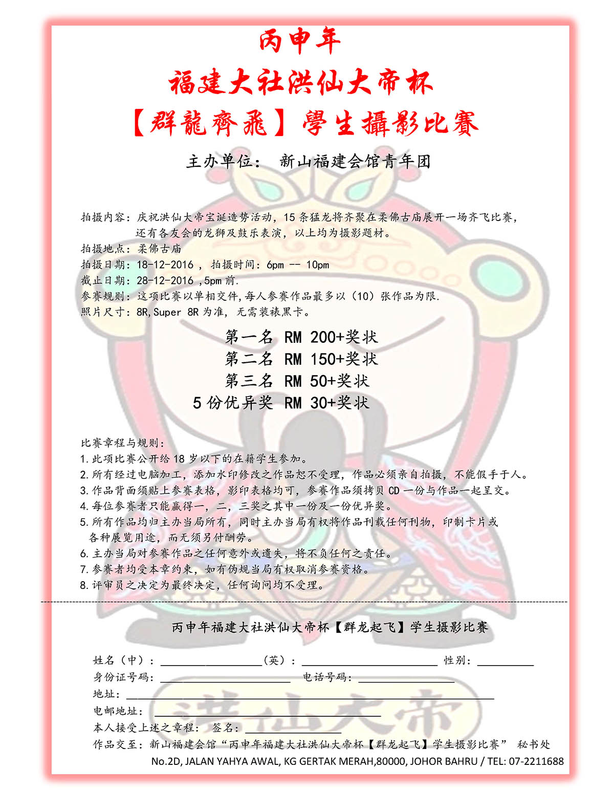 会馆动态 会馆活动 表格下载 December 10, 2016February 19, 2024 洪仙大帝宝诞-群龙齐飞摄影比赛 Posted By: AdminTeam 4194 Views 下载群龙齐飞摄影比赛表格 群龙齐飞摄影比赛表格(学生组)
