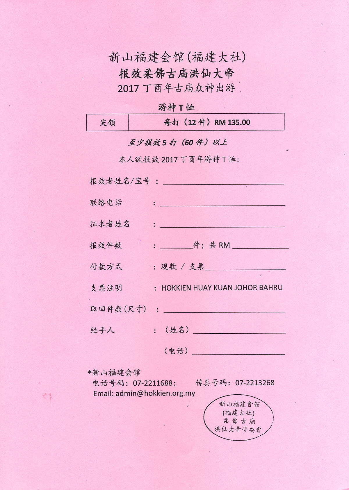 新山福建会馆配合2017年2月16日至18日(农历丁酉年正月二十日至二十二日)恭随洪仙大帝圣驾出游盛会,由即日起接受公众人士订制游神衣服,尖领每打(12件)RM 135.00。公众人士须订制至少5打(60件)以上。游神衣服一律由本会所指定的承包商订制。