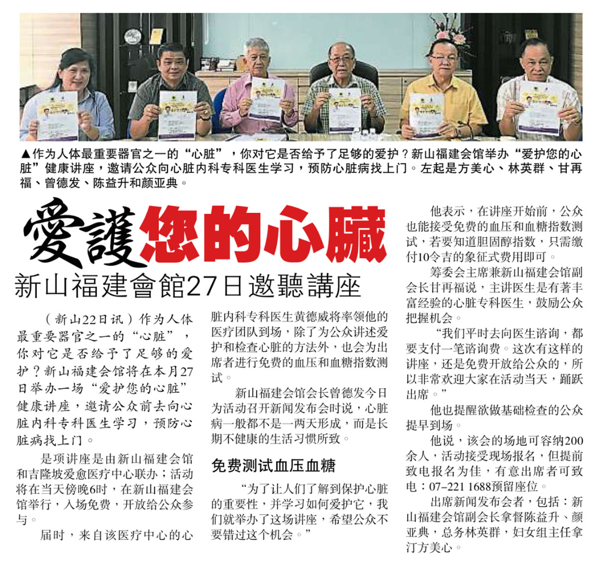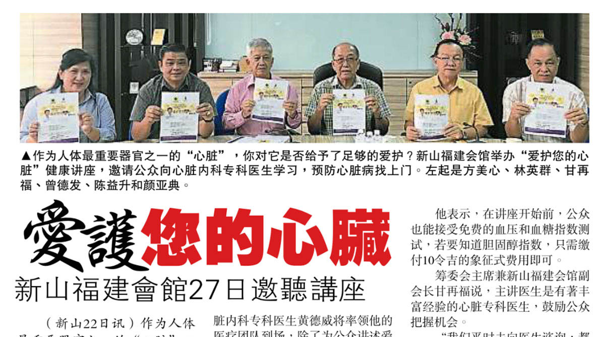 爱护您的心脏-新山福建会馆27日邀听讲座