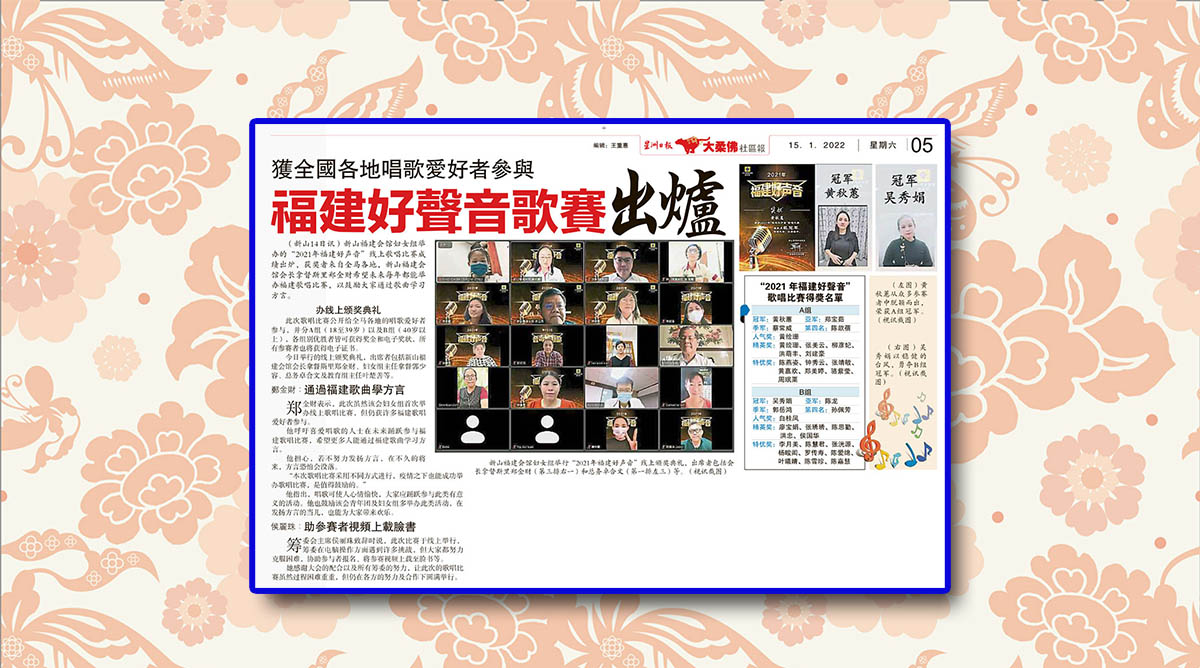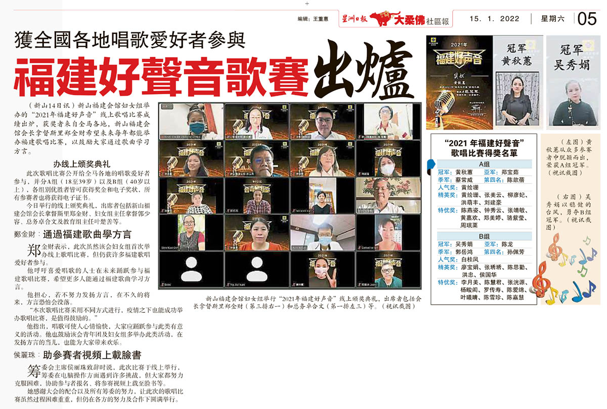 会馆动态 会馆活动 剪报室 妇女组 January 15, 2022February 19, 2024 获全国各地唱歌爱好者参与-福建好声音歌赛出炉 Posted By: AdminTeam 428 Views 星洲日报剪报