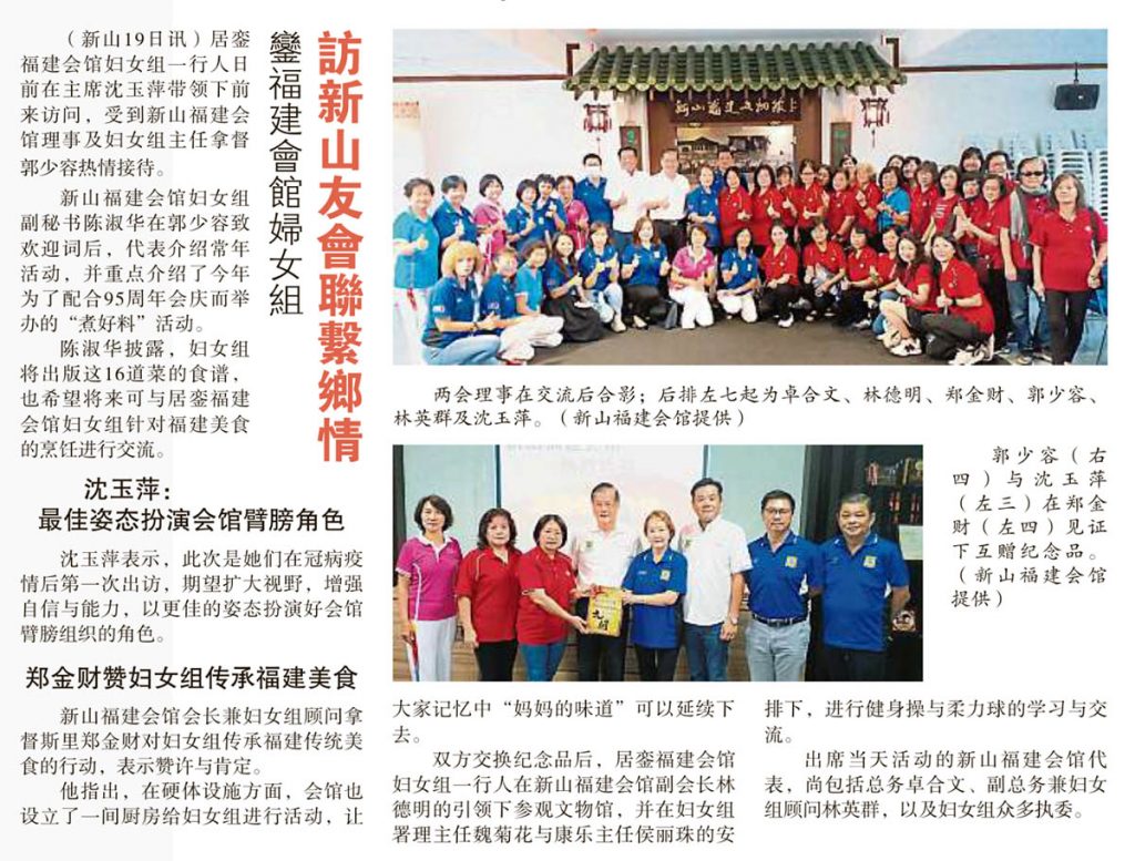 会馆动态 会馆活动 剪报室 妇女组 November 20, 2022February 19, 2024 銮福建会馆妇女组-访新山友会联系乡情 Posted By: AdminTeam 1241 Views 星洲日报剪报