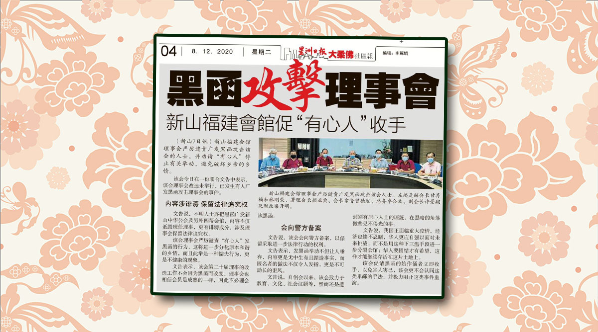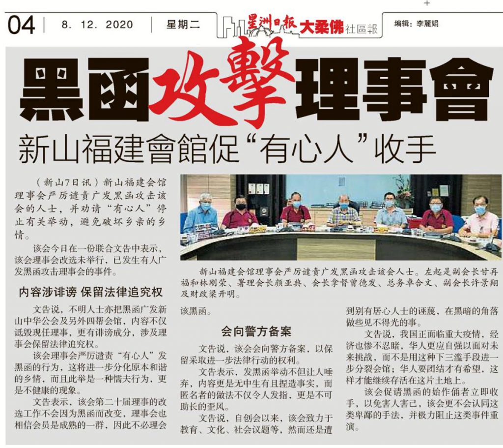会馆动态 会馆活动 剪报室 December 8, 2020February 19, 2024 黑函攻击理事会-新山福建会馆促有心人收手 Posted By: AdminTeam 954 Views 星洲日报剪报