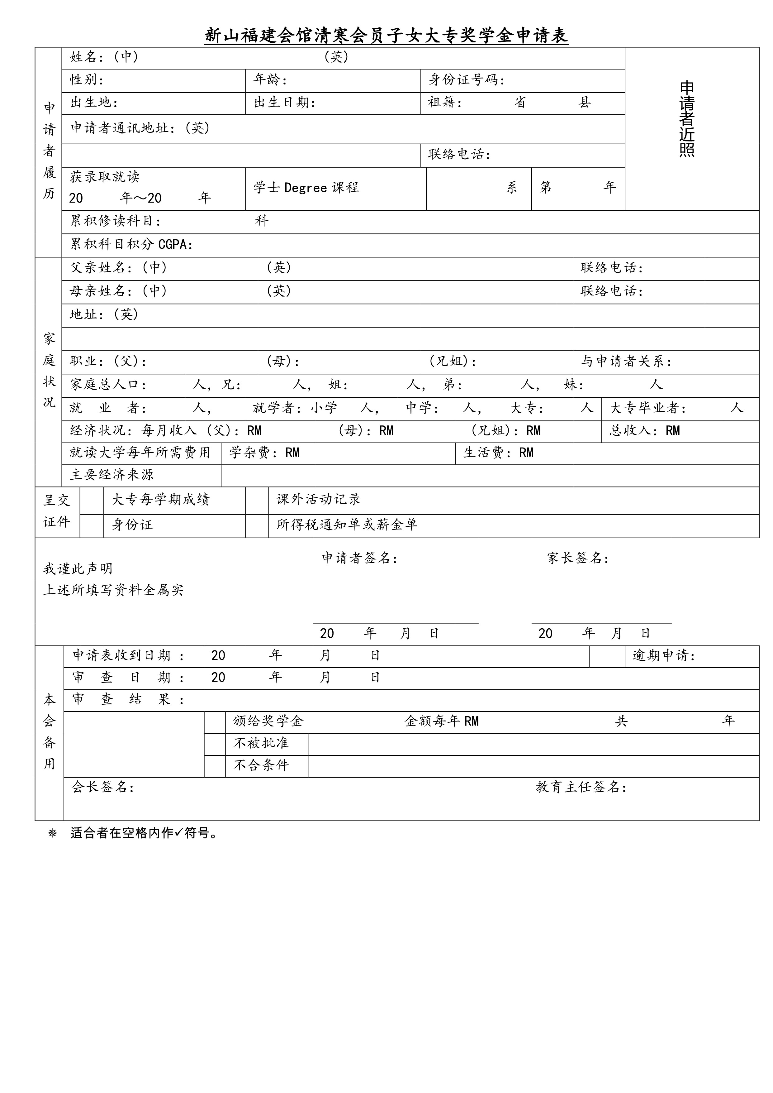凡家境贫寒、品学兼优之会员子女并已在国内外大专入学就读一年degree课程者皆可提出申请。