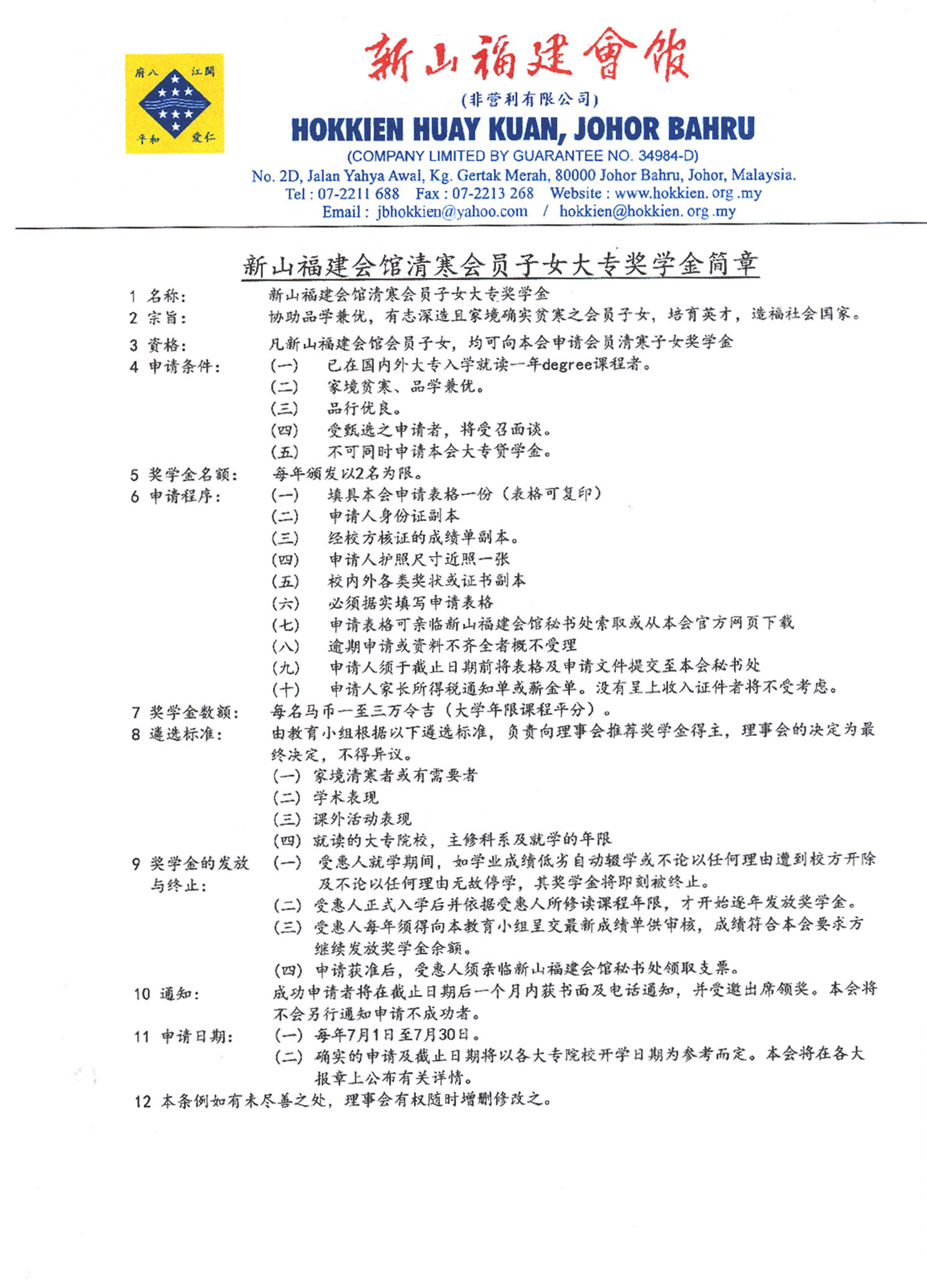 奖学金录取名额以2名为限。欲知详情,请于办公时间(星期一至五:9am-5pm;星期六:9am-1pm)洽询本会馆秘书处。