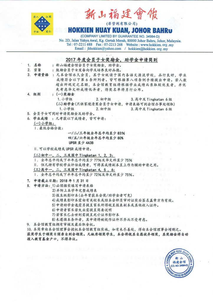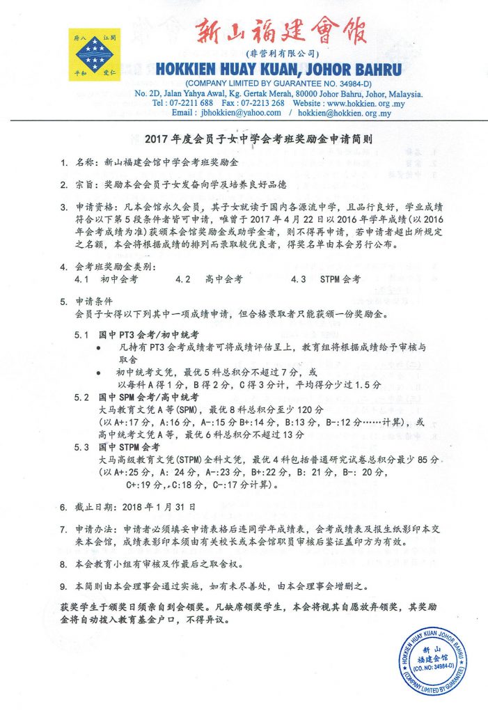 教育组 表格下载 December 15, 2017February 19, 2024 2017年度会员子女奖励金、中学会考班奖励金接受申请 Posted By: AdminTeam 3045 Views 中学会考班奖励金表格下载 会员子女奖励金助学金表格下载
