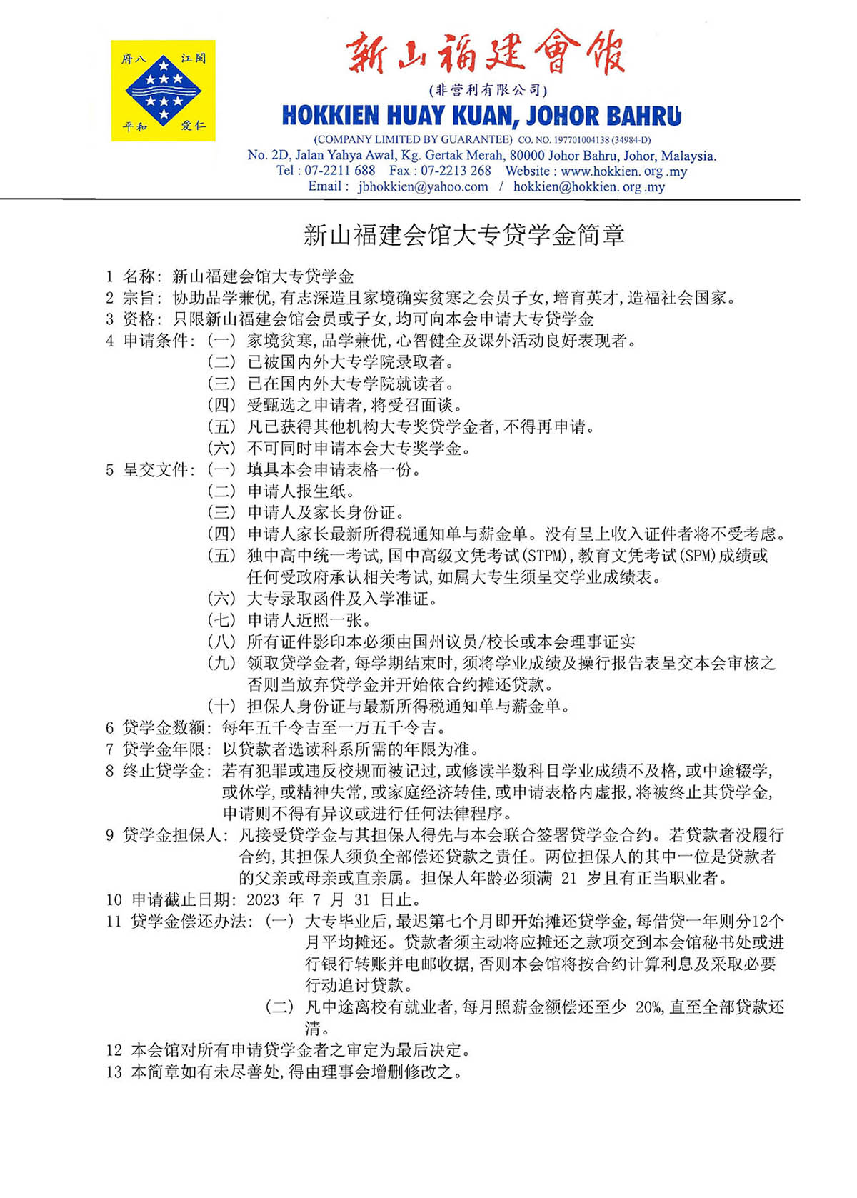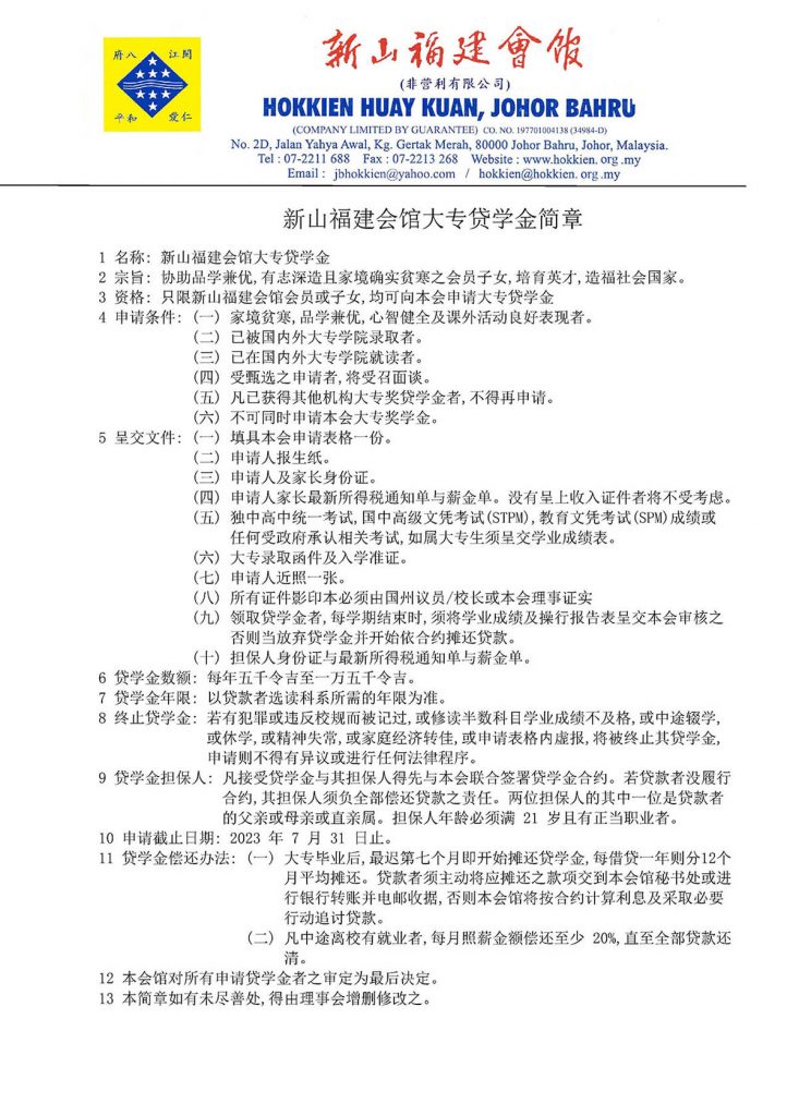 会馆动态 会馆活动 教育组 表格下载 June 8, 2023February 19, 2024 新山福建会馆大专院校贷学金接受申请 Posted By: AdminTeam 1655 Views 下载大专院校贷学金细则及表格