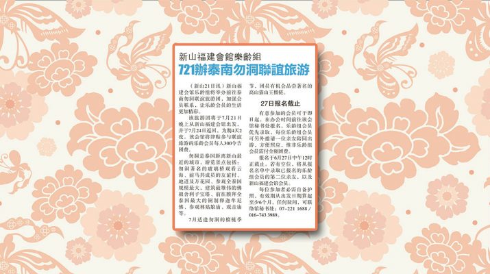 新山福建会馆乐龄组-721办泰南勿洞联谊旅游剪报。